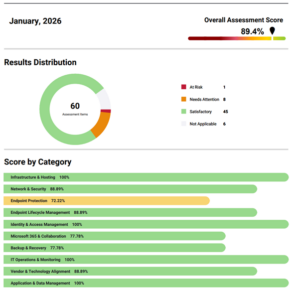 It means regular strategic reviews where you sit down together and look at a scorecard that scores your technology across areas like endpoint protection, backup and recovery, identity management, and Microsoft 365 configuration. Not gut feel. Actual scores, based on defined best practice, that show you exactly where you’re strong and where the gaps are.